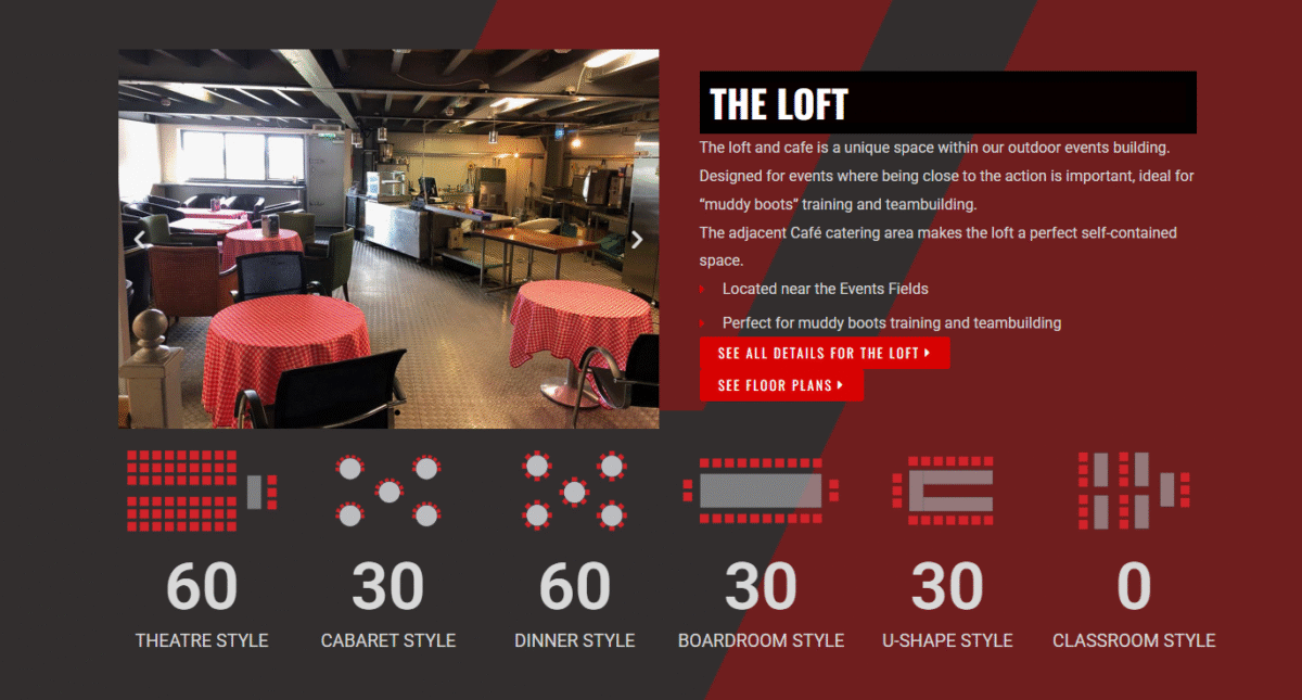 Located within the Heart of England estate, The Loft is a relaxed and quirky space ideal for team-building sessions, workshops and informal meetings. Decorated in rustic woods and industrial accents, this versatile area includes comfortable lounge seating, café-style tables and a nearby bar. The Loft offers natural light and a spacious open-plan layout, making it perfect for training days or social gatherings.